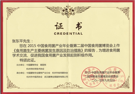张东平在2015年中国食用菌产业年会暨第二届中国食用菌博览会上作《食用菌生产主要病菌发生原因及防治措施》的报告,为增进食用菌学术交流,促进我国食用菌产业发展起到积极作用
